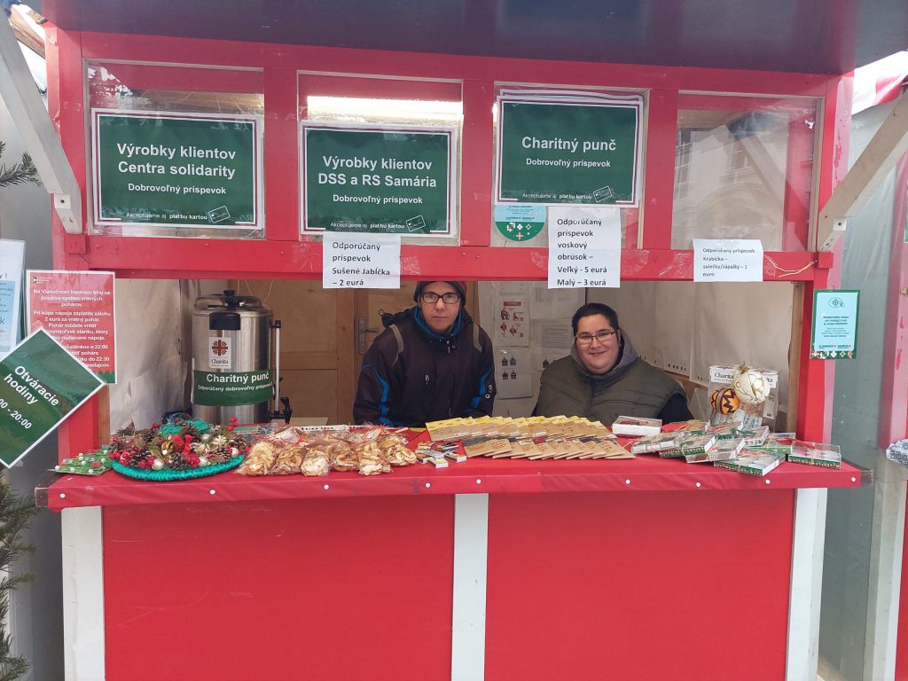 Na Hlavné námestie v Bratislave sa tento rok po dvojročnej prestávke vrátil Vianočný Hlavný trh, a zúčastnili sme sa ho aj my, konkrétne naši zamestnanci a klienti z DSS a RS Samária a Centra podpory (solidarity). Ani zima neodradila našich chariťákov, aby sa s vami naživo stretli a ponúkli vám svoje ručne vyrobené darčeky – vianočné ozdôbky, balíčky sušených jabĺčok či krásne voskové obrúsky.